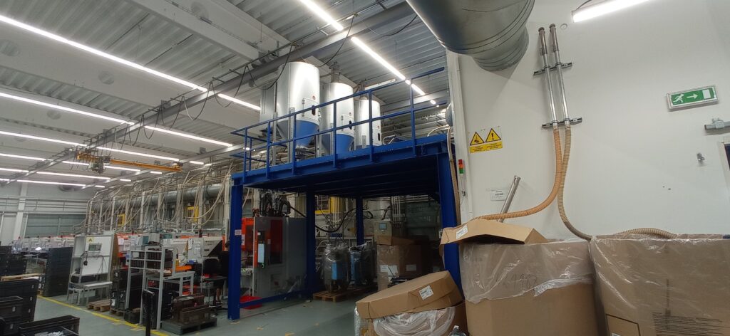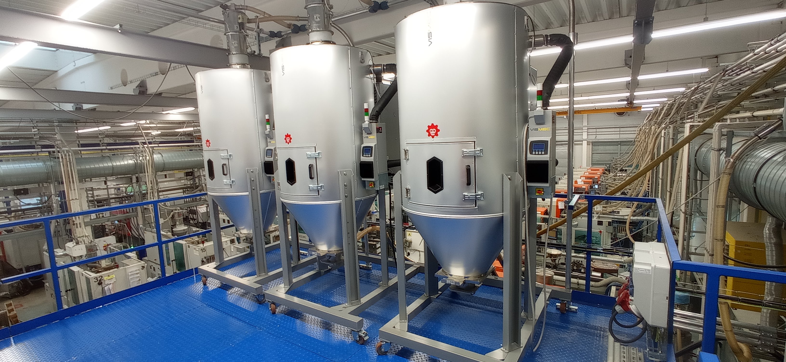 Soubor sucho-vzdušných sušáren sestava sucho-vzdušných sušáren Vismec DW160 ocelová konstrukce mezipatra materiálové odsávací komory dle požadavků zákazníka materiálové trasy